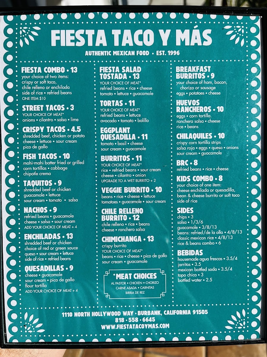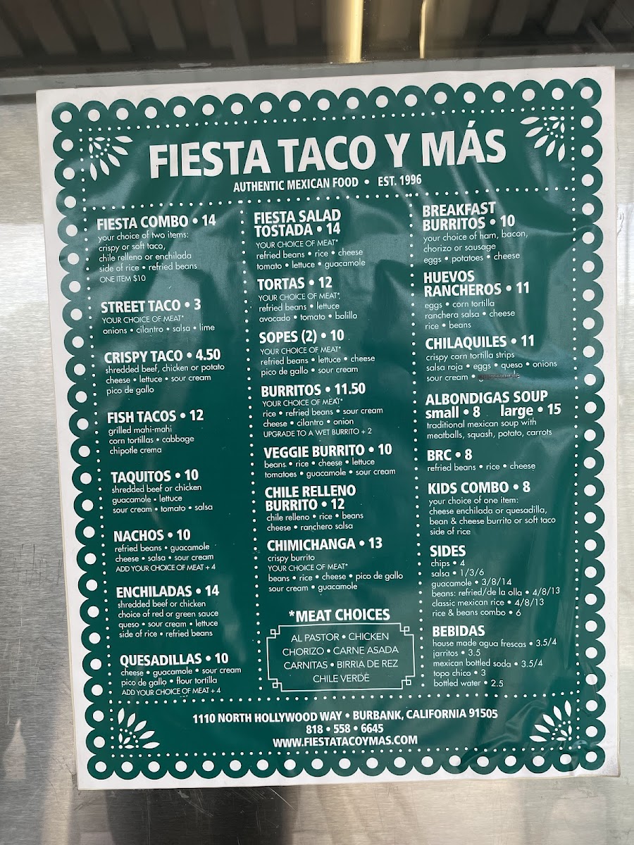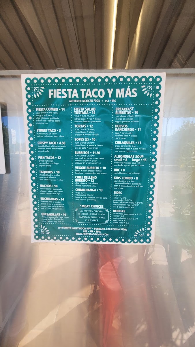 Welcome to Fiesta Taco, an authentic gem nestled in Burbank, California. Located at 1110 N Hollywood Way, this vibrant eatery serves up a menu that celebrates the rich flavors of Mexican cuisine. Breakfast lovers will delight in their hearty Breakfast Burritos, featuring a choice of ham, bacon, chorizo, or sausage, crafted with eggs, potatoes, and cheese for $11. For a delectable lunch, indulge in El Pastor Tacos, renowned for their marinated tenderness, paired with homemade salsas that elevate every bite.